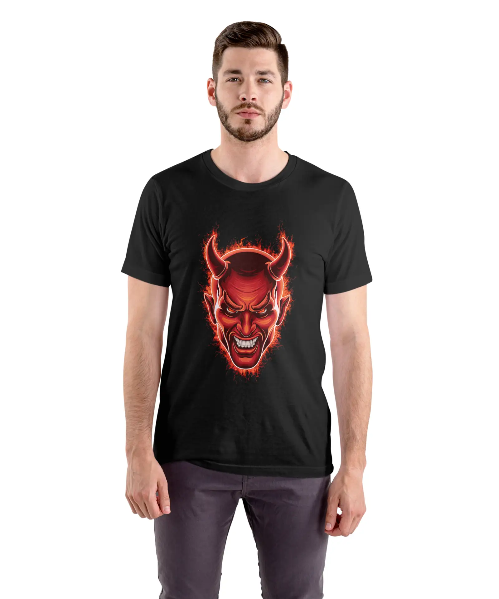 Design vibe: Fierce red devil face with glowing eyes, horns, and flaming effects—edgy, intense graphic for rock, horror, or badass energy.