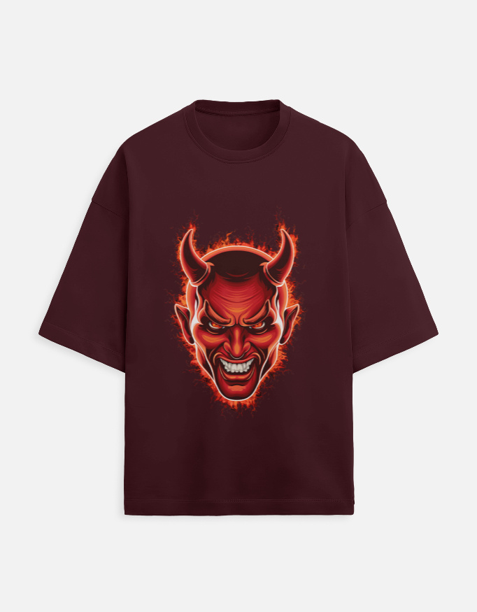 Why This Design Rules Show your bold side. This edgy oversized t-shirt features a fierce devil face. It has glowing red eyes and sharp horns. Plus, swirling flames add intense energy.